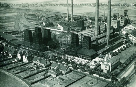 Abb. 114: Im Mittelgrund die Zeche Wiendahlsbank mit vorgelagerten, mehrstöckigen Arbeiterhäusern. Zu erkennen ist der Malakoffturm Friedrich und östlich davon beide Bergehalden. Ganz links die Glashütte Kruckel, ganz rechts am Horizont die Zeche Kaiser Friedrich, um 1900.